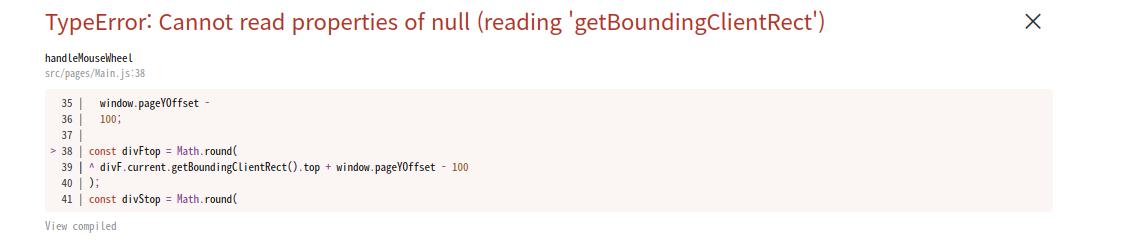 isModal은 boolean 타입으로 작성되었다. false 일 경우에는 divF 변수에 접근할 수 있어서 handleMouseWheel 함수가 정상 작동한다. 하지만 isModal이 true 일 경우 <TotalModal /> 컴포넌트가 렌더링 되면서 containerEle가 useRef()로 접근할 element가 사라지게 되고 그 결과 다음과 같은 error를 겪게 되었다.